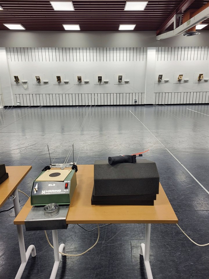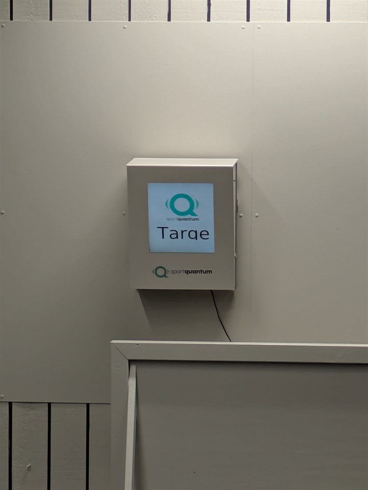 Första elektroniska tavlan på plats på väggen i skyttehallen